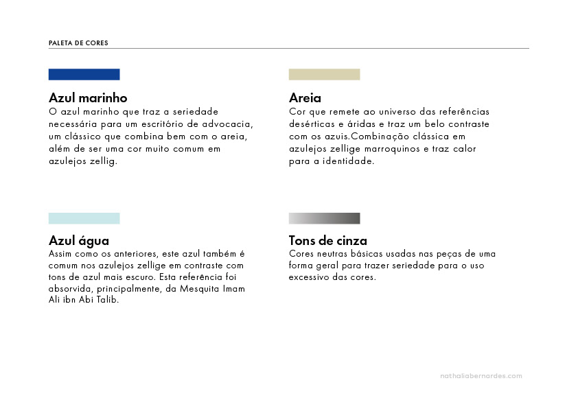 As cores mantêm a combinação clássica do areia do clima quente marroquino, uma característica da personalidade da cliente, com um azulado contrastante e urbano com tons abertos e vibrantes. Já as famílias tipográficas escolhidas foram somente tipos não serifados, de maneira a se afastar da clássica serifa já um pouco em desuso em identidades recentes na área da advococia, mas ainda assim com muita personalidade e diferentes entre si de maneira que seja possível oferecer um contraste mesmo entre duas sans serif. Por fim, o ícone busca um visual menos feito à mão e mais geométrico, urbano e marcante.