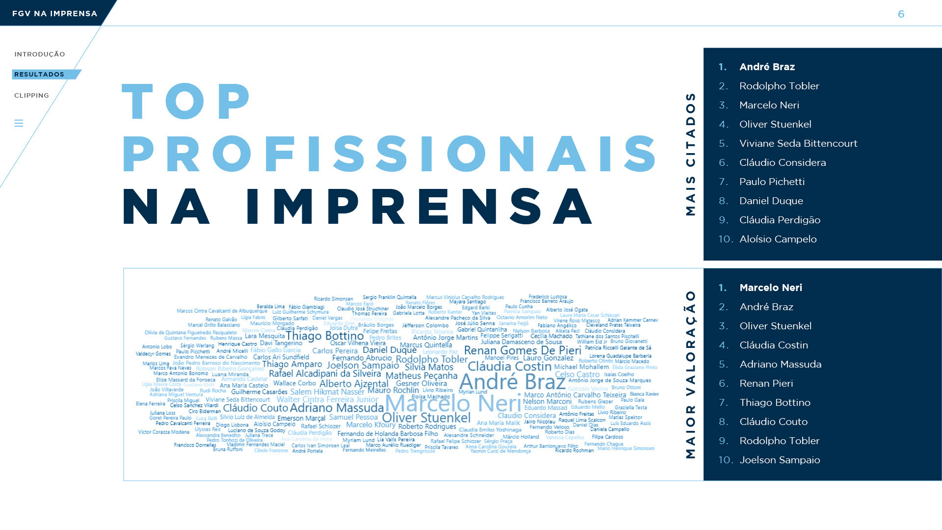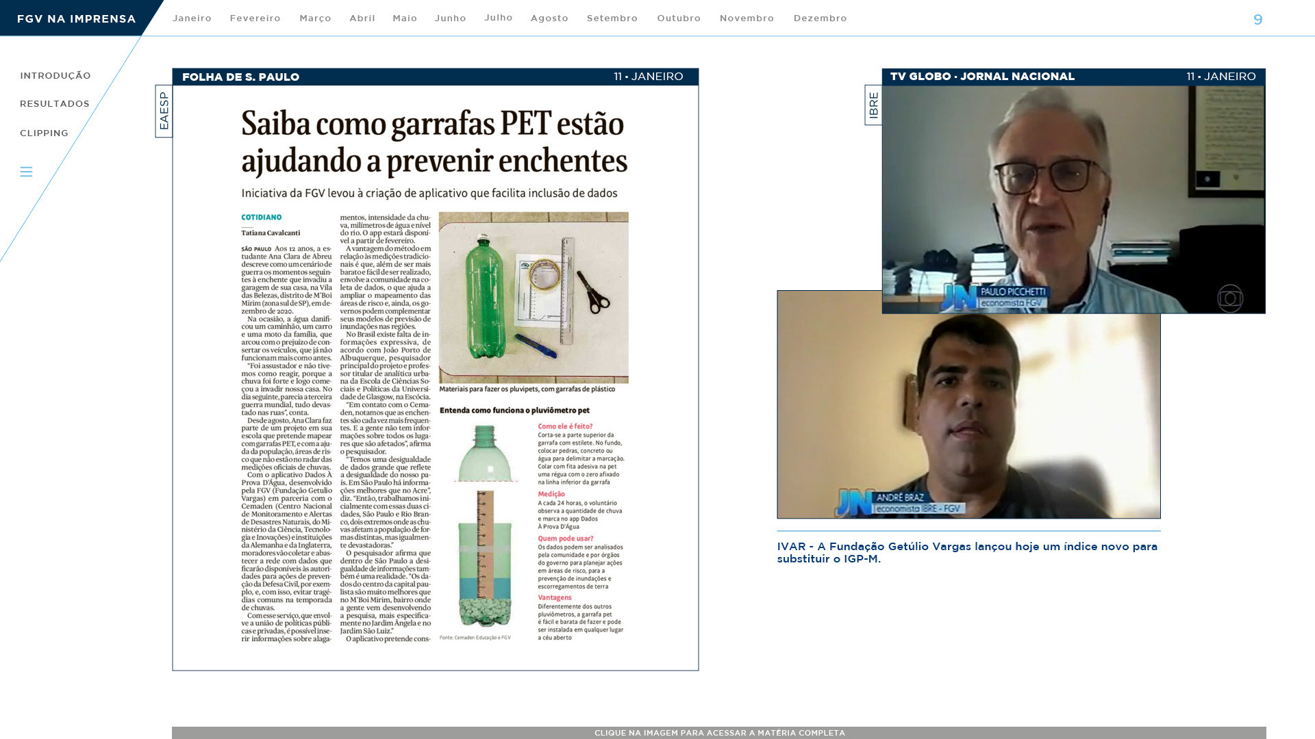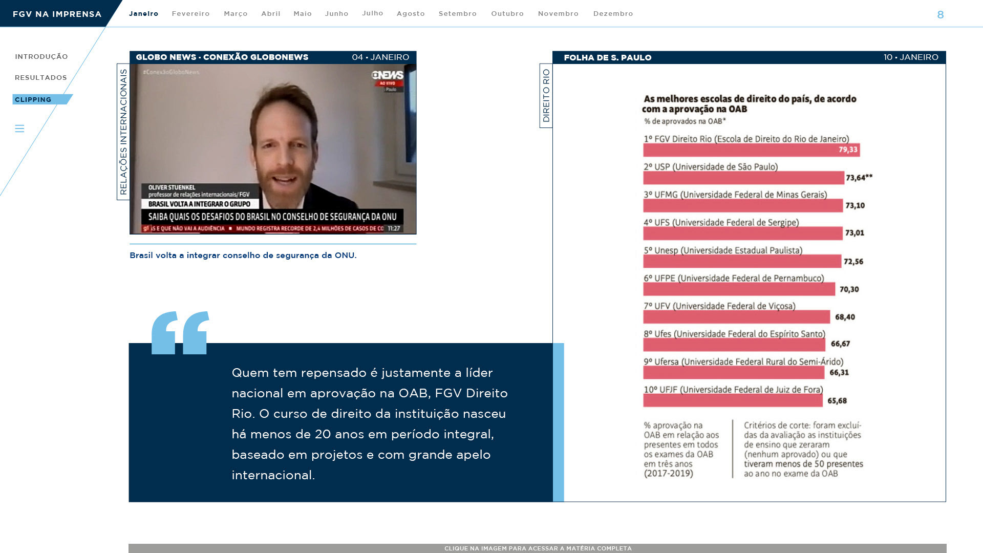 Anualmente é feito um book com o clipping de notícias onde a FGV apareceu no ano anterior. Com isso é possível distribuir aos diretores e destacar a importância da Diretoria de Comunicação na divulgação de cada escola. Assim, foi pensado um book digital onde fosse possível interagir com ele, clicando nas imagens para levar às notícias, clicando em botões de navegação, menu, etc.