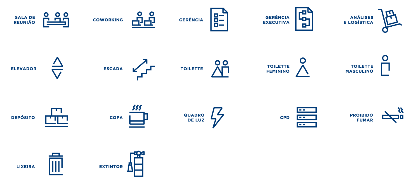 Para as placas optamos pela escolha do estilo bandeira por ser possível visualizar a categoria de sala já no início do corredor, sem a necessidade de passar em frente a todas e talvez não achar a que buscava. Tendo em vista um visual sem excessos de informação, suprimimos o uso de iconografia na placa e optamos somente pela descrição textual. A cor escolhida para o texto foi o azul marinho da paleta FGV como forma de trazer algum elemento da nossa identidade de forma sutil.