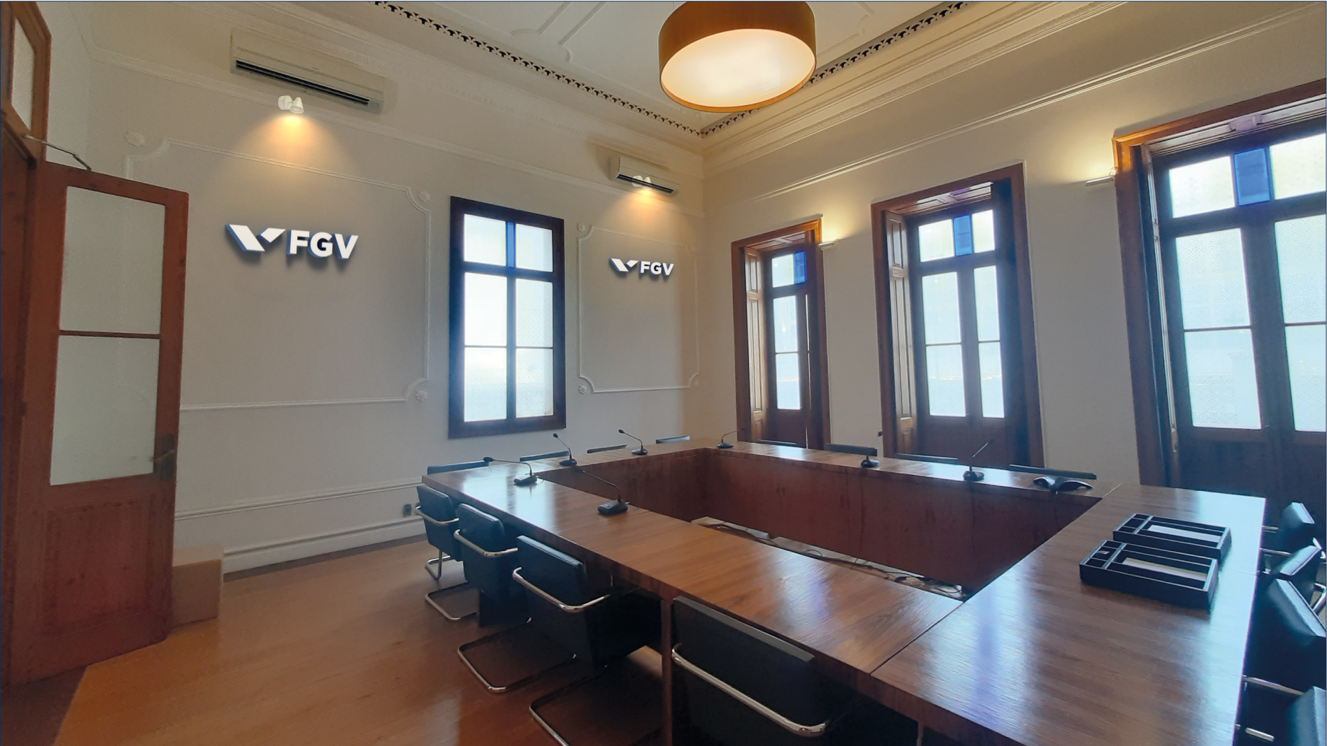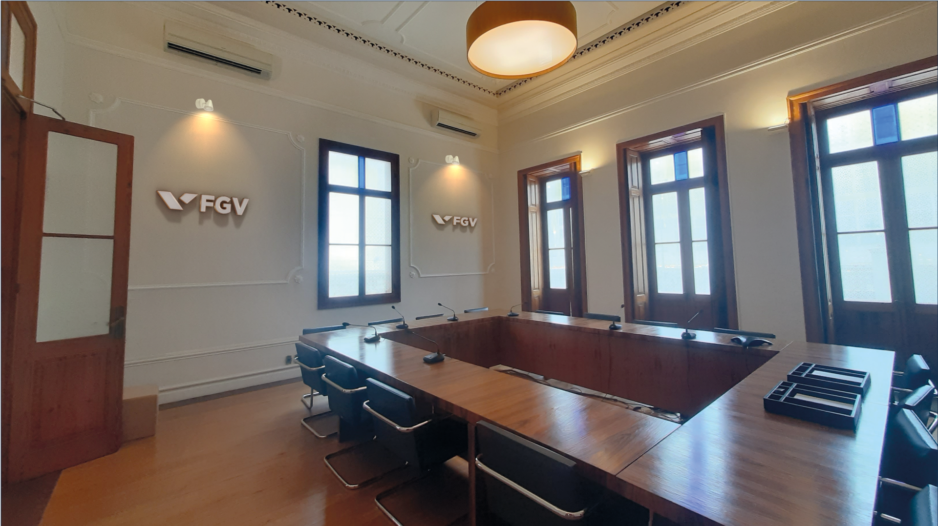 Para as letras caixa optamos por trazer o contraste entre o branco e o azul, ambas cores da paleta de FGV, tendo a sua frente branca e as laterais azuladas. Assim, ao se aproximar pelo lado vemos uma cor e ao ficarmos de frente observamos outra, o que faz com que essa solução seja também interessante. Para chamar mais atenção para o logo e trazer mais dramaticidade, sugerimos uma luz spot quente direcionada sobre a letra caixa. OBS: É necessário testar a espessura da letra caixa para fazer uma sombra considerável com a luz spot.