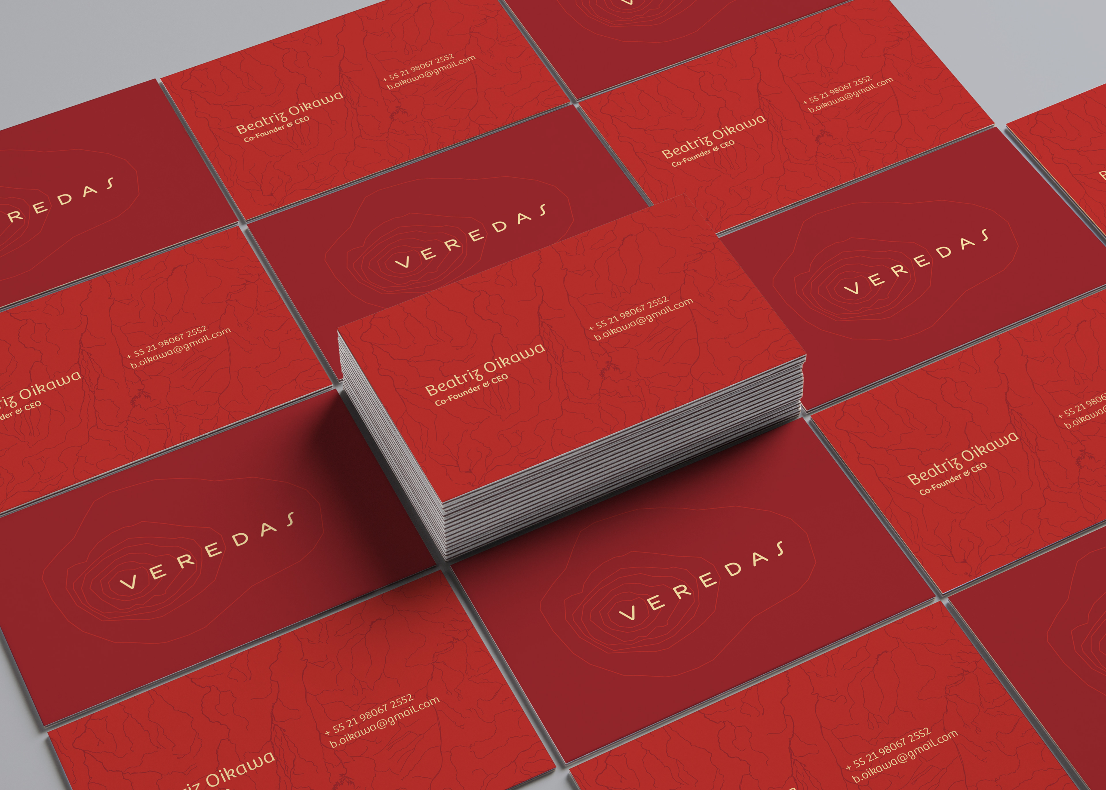 Por isso, a ideia é transmitir confiança através de um design que una o profissionalismo com uma relação calorosa, trazendo cores quentes para representar esse aconchego e o calor do Vulcão de Fogo, com linhas familiares que conectam o profissionalismo dos ângulos e linhas com a familiaridade dos mapas da America Latina. A marca Veredas tem em seu símbolo uma referência direta à Guatemala por ser literalmente as curvas de nível do Vulcão de Fogo, enquanto a sua fonte se deve a união do profissionalismo de uma sem serifa com a suavidade de um acabamento soft. Também seu S remete a um caminho e o leve achatamento forma um todo mais conciso e harmônico.